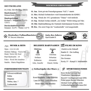 Was war 1985 angesagt? Welche Stars waren in den Schlagzeilen? Welche Musik lief im Radio? Was kostete ein Pfund Butter? Die Karte gibt charmante Einblicke in das Leben und die Kultur der 80er-Jahre – liebevoll recherchiert und grafisch im Vintage-Stil aufbereitet.
